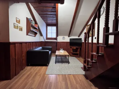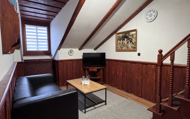 Vitajte v azda najzaujímavejšej izbe v našom Penzióne. Malá, ale útulná izba prekvapí svojim štýlom akéhosi mezonetu, rozumej so schodami v rámci izby,